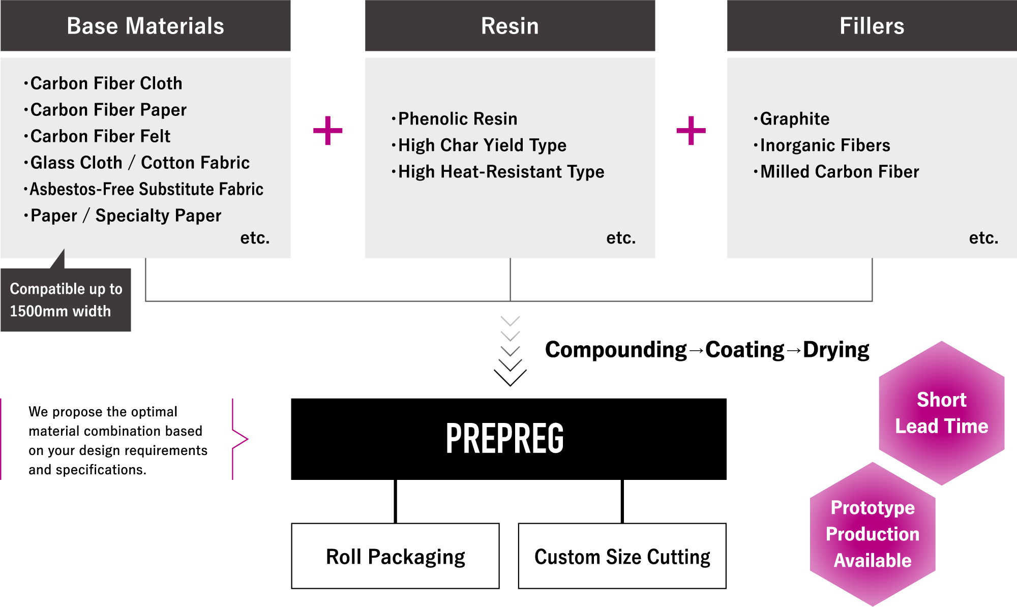Our base materials and resins are not limited to these. We handle a wide range of base materials including woven glass fiber and cotton fabric in addition to carbon fiber, as well as resins other than phenolic.